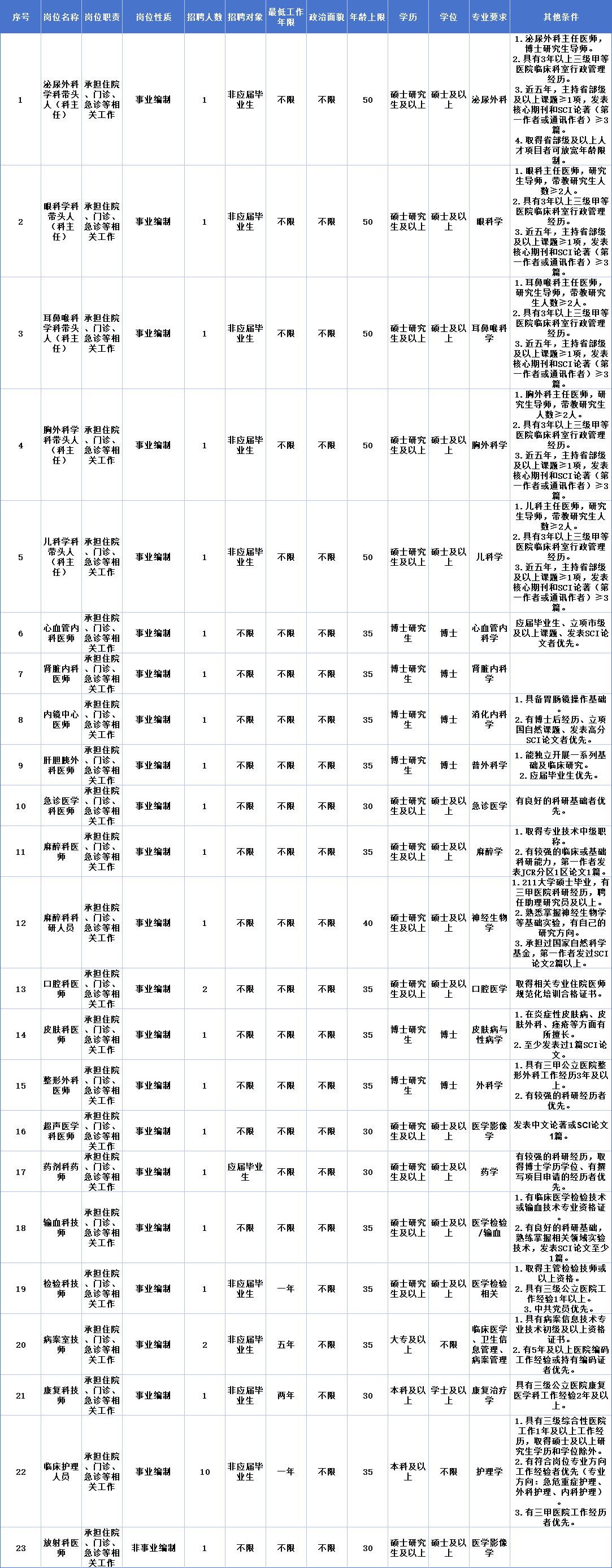 原事業(yè)編制、中高級職稱、規(guī)培合格人員、緊缺專業(yè)人員等可適當(dāng)放寬學(xué)歷學(xué)位要求。